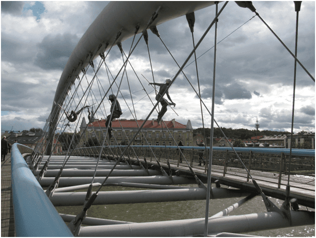 Хотя мост получил новое название, многие горожан называют его Подгурским, так что фактически названий два. Среди других переправ Кракова эта конструкция выделяется необычными скульптурами, размещенными на вантах и основной балке. Они словно висят в воздухе, чудом удерживая равновесие, это творения известного польского мастера Ежи Кедзиора. Впервые он представил свои изделия на выставке «Между небом и землей», проходившей именно на мосту. Но когда пришло время убирать скульптуры, горожане выдвинули предложение, чтобы эти фигуры оставить, потому что они придают конструкции уникальность.