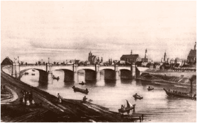 Когда Краков вошел в состав Австрии, в 1801 году городские власти начали рассматривать вопрос крепкой и надежной переправы. До дела дошло в 1844 году, строительство длилось 6 лет. Это была деревянная конструкция – 5 пролетов, сделанных из гнутой древесины лиственницы, обтянутые свинцовыми листами и обмазанные смолой. Арок насчитывалось 7, каждая состояла из 5 балок, а крайние тоже обшили досками из лиственницы. Мост впервые поставили на каменные опоры, для строительства даже была задействована экстраординарная по тем временам новинка – паровая машина, которую привезли из Гливице.