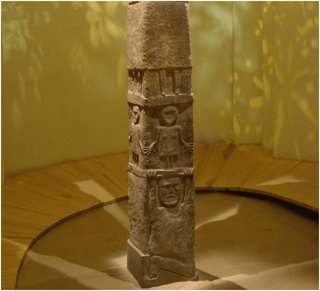 На всіх 4 гранях ідольського стовпа чітко виділені 3 горизонтальні яруси, розділені рельєфними лініями. На верхньому ярусі зображені 4 фігури богів і богинь, історики певні, що це богиня землі Макош, богиня кохання Лада, покровитель воїнів Перун та сонячний Дажбог. На середньому ярусі невідомий майстер зобразив людей, які водять коло, на нижчому – 4 постаті, які стоять навколішках і тримають руками середній ярус. Є припущення, що один із них – бог скотарства і підземних сил Велес, який тримає на собі вагу землі. Ці малюнки підтверджують язичницький тридільний поділ світу: Права – верхній світ богів, Ява – середній, де живуть люди, Нава – підземна царина.