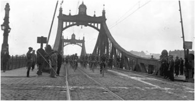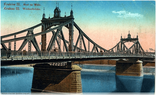 Перша спроба створити міст через Віслу з Кракова до Подгуже була зафіксована у 1908 році, будівництво тривало 5 років. Керував процесом відомий віденський будівельник Едвард Ціттер, оскільки на той час Краків належав Австро-Угорській монархії, фахівця прислали з центру. Перший варіант мосту встигли поставити у 1911 році, але через неочікуване величезне скупчення крижин центральна частина залізної конструкції на 52 метри завдовжки не витримала ударів та пішла під воду. Довелося знову починати роботи, але вже з урахуванням можливих проблем з боку стихії.
